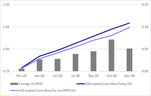 RBA-dated OIS pricing shows tightening across all meetings, with the probability of a 25bp hike rising from 15% for March to 95% by June and 154% by December 2026.