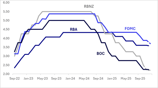 Philippines Q3 GDP growth was well below expectations, printing at 4.0%y/y (versus 5.2% forecast, while 5.5% was the Q2 outcome). In q/q terms we rose 0.4%, half the pace expected (0.8% was consensus) and well below the 1.5% gain seen in Q2 q/q growth. The y/y pace is now at its slowest since 2021 (as growth rebounded from the Covid pandemic), see the chart below. Today's data adds firmly to the case for a BSP cut at the Dec policy meeting (held Dec 11). Economic Planning Minister Balisacan was confident growth would improve (with efforts to step up by the government) but noted it would be a challenge to meet the lower end of the growth target (5.5-6.5%).
