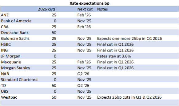 The rate outlook is far from unanimous with Westpac forecasting 25bp rate cuts in November, February and Q2 2026, while JP Morgan believes rates will stay where they are now at 3.6%.