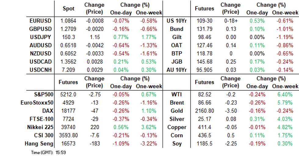 - Jun'24 10Y futures pushed higher after the BoJ lifted rates, hitting a high of 110-01 we now trade just off those levels at 109-30+, up + 04+ since NY closed