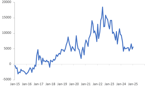 South Korea: Recorded outflows of -$678m yesterday, bringing the 5-day total to -$2,629m. 2025 to date flows are -$6,255m. The 5-day average is -$526m, the 20-day average is -$110m and the 100-day average of -$112m.
