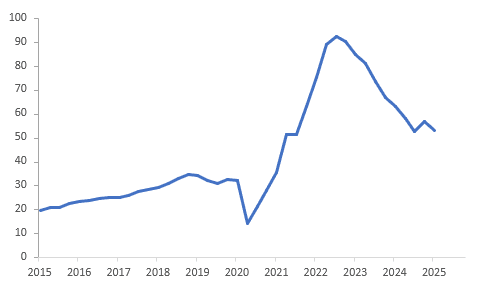 The vacancy ratio fell to 53.4% from 57% in Q4, but was still above Q3’s 52.6%. It is now down almost 40pp from Q3 2022 peak of 92.7%. Q2 will indicate if the downtrend that stalled at the end of 2024 has resumed.