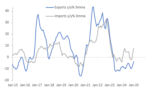 February’s drop in exports was due to a sharp fall in non-monetary gold, while rural goods saw a broad based increase of 4.4% m/m to be up 26.1% y/y. Non-rural goods fell 2.3% m/m and 16.2% y/y with key commodity shipments lower. The data is nominal.