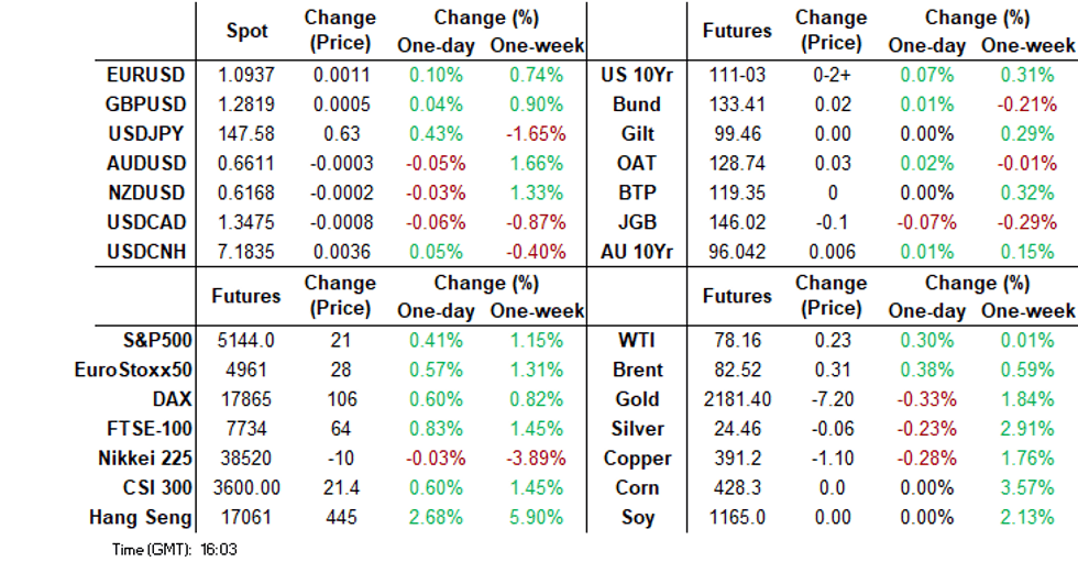 - Treasury futures have traded in very tight ranges today with Jun'24 10Y making lows of 111-18 and highs of 111-21, to currently trade + 01 for the day at 111-20, while 5Y futures are +00¼ to 107-20¼