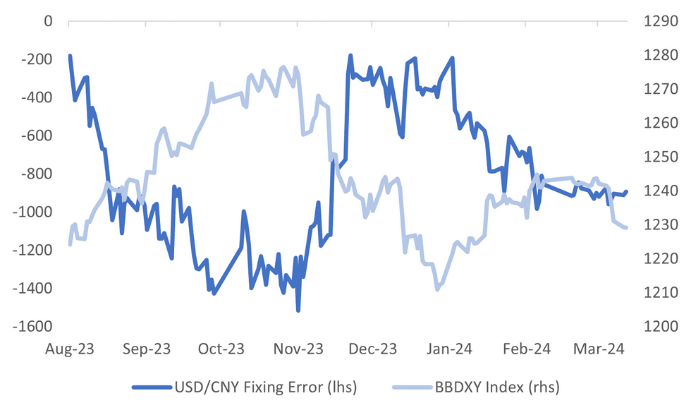 - It's also noteworthy the USD/CNY fixing error (the difference between the actual fixing and the consensus Bloomberg estimate) has stayed wide, even in the face of recent USD weakness.
