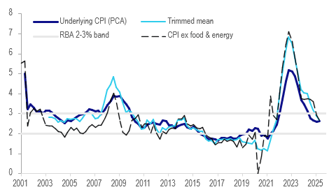 The Q2 trimmed mean measure of inflation moderated further towards the RBA’s target mid-point of 2.5%. It printed at 2.7% with the 2q/2q average annualised at 2.6%. Our PCA measure of underlying inflation came in at 2.6% for the second straight quarter, very close to the band mid-point. The downtrend in core inflation as well as market services inflation now within the 2-3% band should reassure the RBA that inflation is sustainably within target and result in a 25bp cut on August 12.