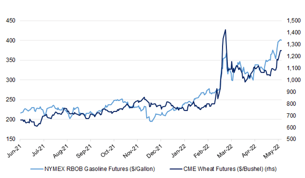 Fig. 1: NYMEX RBOB Gasoline Futures ($/Gallon) & CME Wheat Futures ($/Bushel)