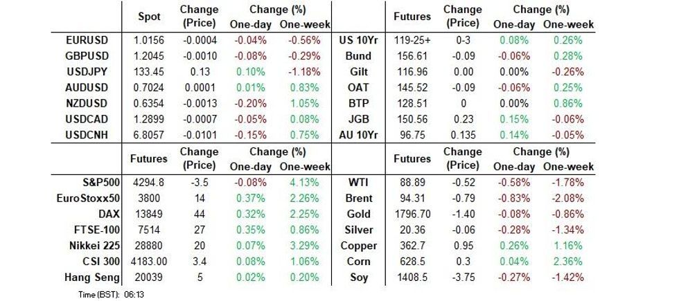- Cash Tsys sit 0.5-1.5bp richer across the curve, with only the 2- & 3-Year tenors having a look through Monday’s richest levels during Asia dealing, with those moves being limited in nature.