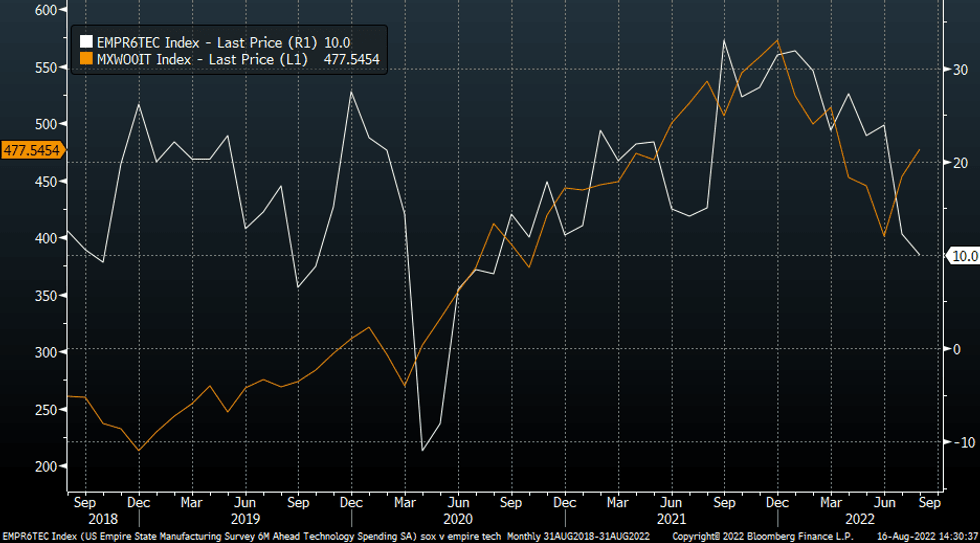 - Overnight the slump in the empire manufacturing survey (-31.3 versus +5.0 expected) cast a fresh cloud over the US/global growth backdrop. Most of the detail of the survey painted a bearish outlook, although one of the sub components of the survey looks at intentions around the tech spending outlook for the next 6 months. This sub-index also fell, but much more modestly, down to +10 from +12 in July.