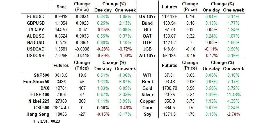 Cash Tsys run little changed to 1bp richer into London dealing, with marginal flattening of the curve observed. TYZ2 operated within a 0-07 range during Asia hours, last dealing in the middle of that tight band, +0-02 at 112-19, on ~79K lots.