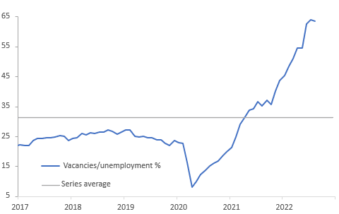 Vacancies to unemployment (%) remain very high