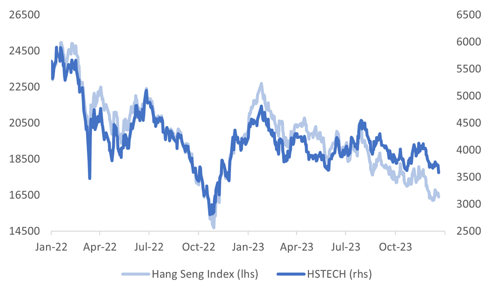 Hong Kong equities continue to track lower post the lunch break. The aggregate HSI is off over 1%, while the tech sub index has slumped 3.3%, although this is up from session lows (-4.5%).