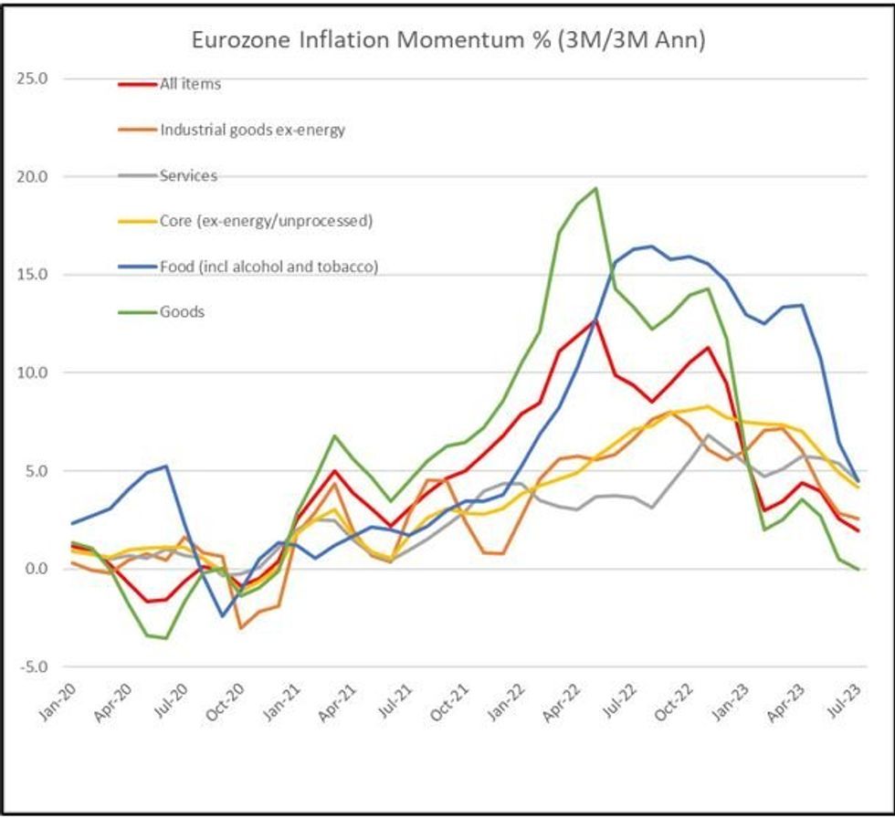 - Monthly core HICP and services inflation remained steady at a high rate, but MNI calculations indicate that momentum across all key inflation components fell in July.