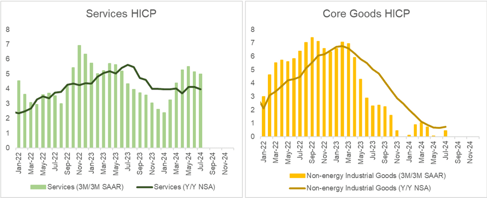 - Familiar themes remained at play though. Services HICP fell by 0.1pp to 4.0% Y/Y but is yet to show signs of meaningful further disinflationary progress, while core goods inflation accelerated 0.1pp to 0.8% Y/Y.