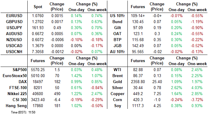 JPY weakness again pervades across G10 currencies, with USD/JPY touching a new high overnight at 161.94, and AUD/JPY's winning streak extending to 108.21. JPY weakness comes as the equity rally resumes. The strong finish on Wall Street yesterday has fed into positive European performance, with the still-fading odds of a right-wing majority also helping contribute to better risk sentiment today.