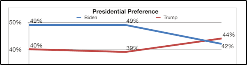 Notably, according to the poll: “Biden underperforms Democratic registration strength and a Democratic generic ballot advantage. Biden trails by 2 points on the ballot despite the Democratic Party carrying a narrow edge on registration over Republicans (32%-31%), party identification (47%-46%), and on the generic ballot (46%-43%).”