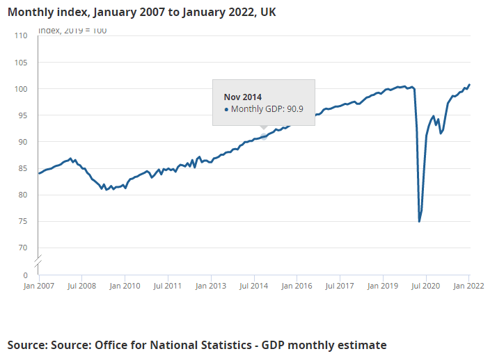 The UK economy rebounded smartly in January, rising by 0.8%, the Office for National Statistics said Friday, far exceeding analysts’ forecasts of a 0.1% gain. That takes output 0.8% above its pre-pandemic level in February 2020.