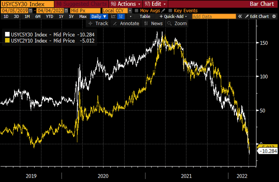 US 2s10s (yellow) and 5s30s (white)Source: Bloomberg
