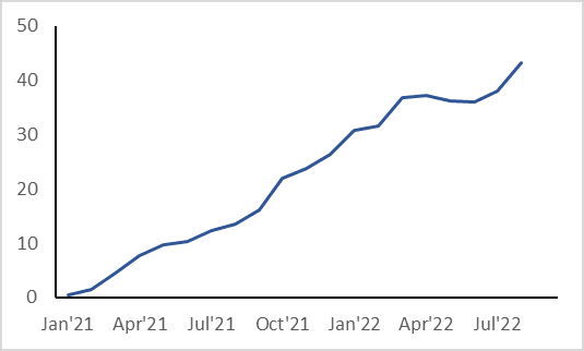 Euro area factory-gate inflation accelerated to a fresh record high of +43.3% y/y in August, surging +5.0% m/m alone. This was largely in line with expectations, flagged by national PPIs following the renewed commodity price jump in August which has cooled again into September. August energy sector prices jumped a massive 11.8% m/m, whilst PPI ex. energy increased a more modest 0.3% m/m.