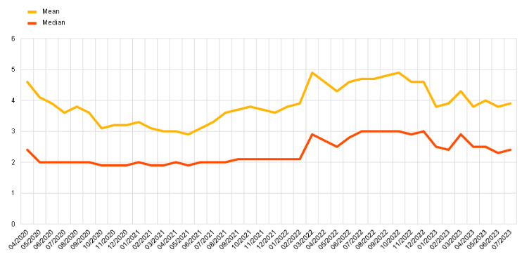 Euro area consumer inflation expectations for the next 12 months were unchanged at 3.4% in July, the latest ECB survey showed, while expectations for three years ahead edged modestly higher. The outlook for price changes three years ahead edged up to 2.4%, from 2.3% in June, but they still remain well below the perceived past inflation rate, particularly at the three-year horizon. Uncertainty about inflation expectations over the next 12 months was unchanged for the second consecutive month, the Consumer Expectations Survey showed.