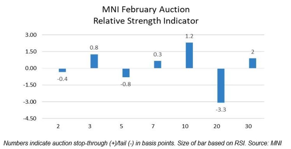 - February’s coupon auctions were mixed. 3 coupon sales tailed, which all saw a negative reading on MNI’s Relative Strength Indicator, although the 5Y relative strength improved from January (-0.8 vs -2.2 prior). The remaining 4 coupon sales traded through.