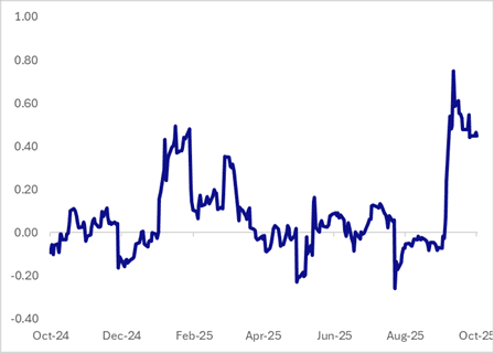 Figure 1: RBA Cash Rate Vs. OIS 6M1M (6M Ago)