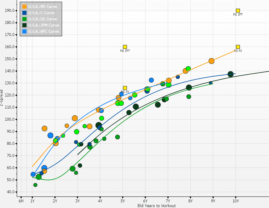 Curve - MS did pretty well in Q1. The MS Curve trades wide of GS and JPM to such an extent it is difficult to match with the rating view. It trades a little wide to BAC which makes sense given the latter's size and diversification.