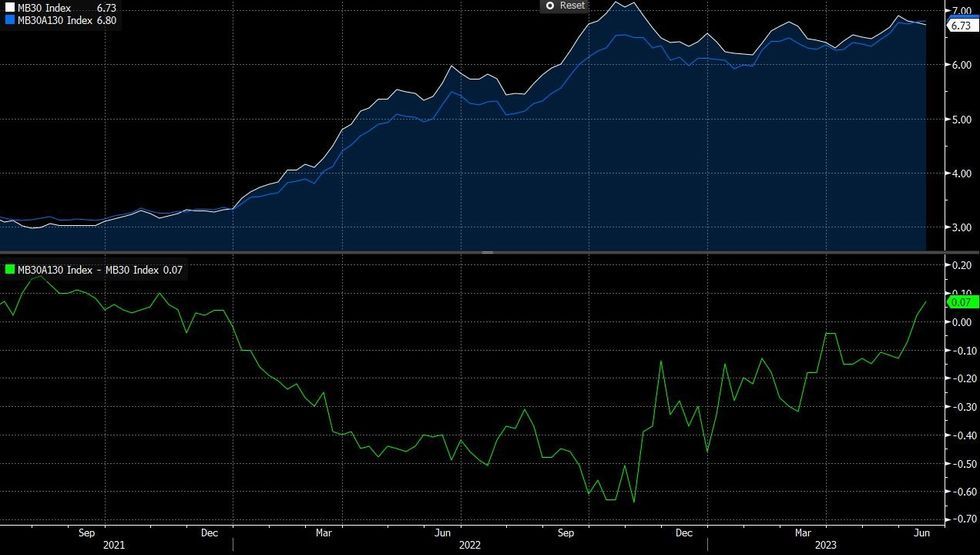 - The regular-jumbo spread widened to 7bp from 2bp prior (the latter marked the first premium for Jumbo over regular for the first time since Dec'21). As the MBA report notes, this is potentially a sign of tighter conditions since March's banking turmoil, as jumbo lenders pull back.
