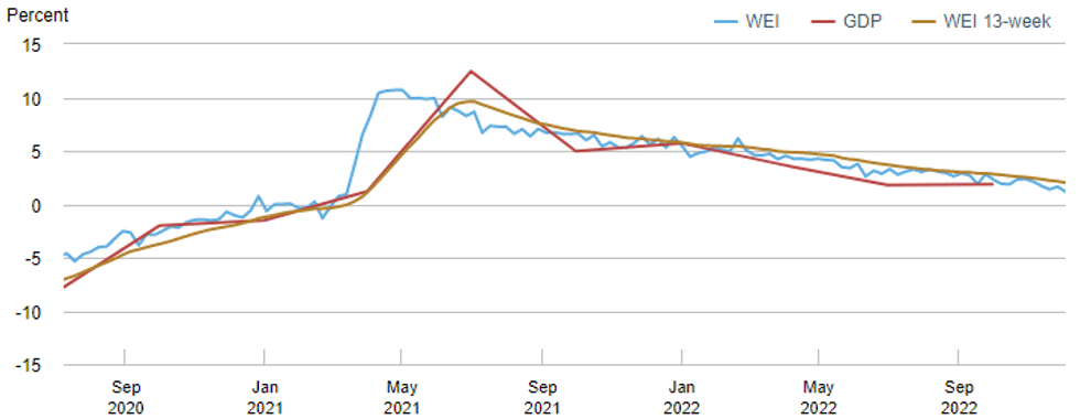 NY Fed explains the latest WEI decline to 1.18% from 1.64% the week prior "is due to falls in retail sales, consumer confidence, and railroad traffic, and a rise in initial unemployment insurance claims, which more than offset increases in steel production, tax withholding, electricity output, and fuel sales."