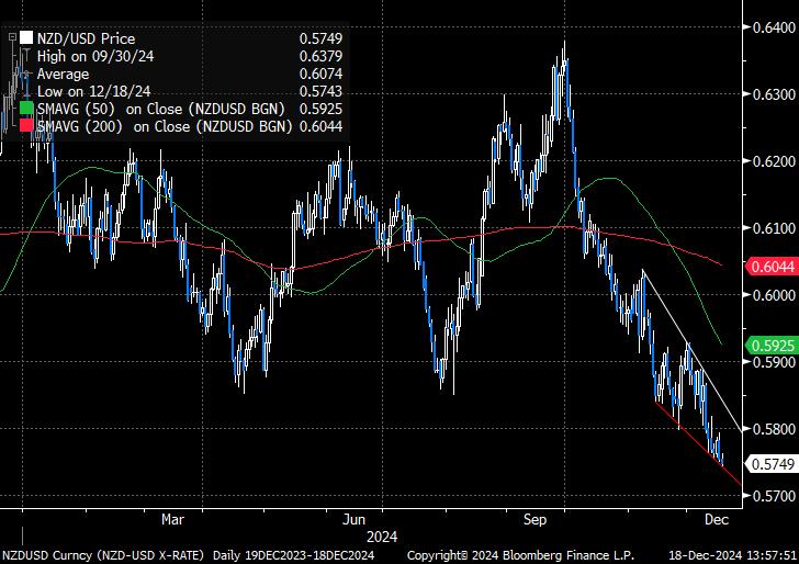 RBNZ dated OIS pricing closed little changed. 46bps of easing is priced for February, with a cumulative 109bps by November 2025. With respect to end-2025 rate expectations, NZ has been the $-blocs worst performer, with the expected OCR some 25bps firmer than last Friday’s close.
