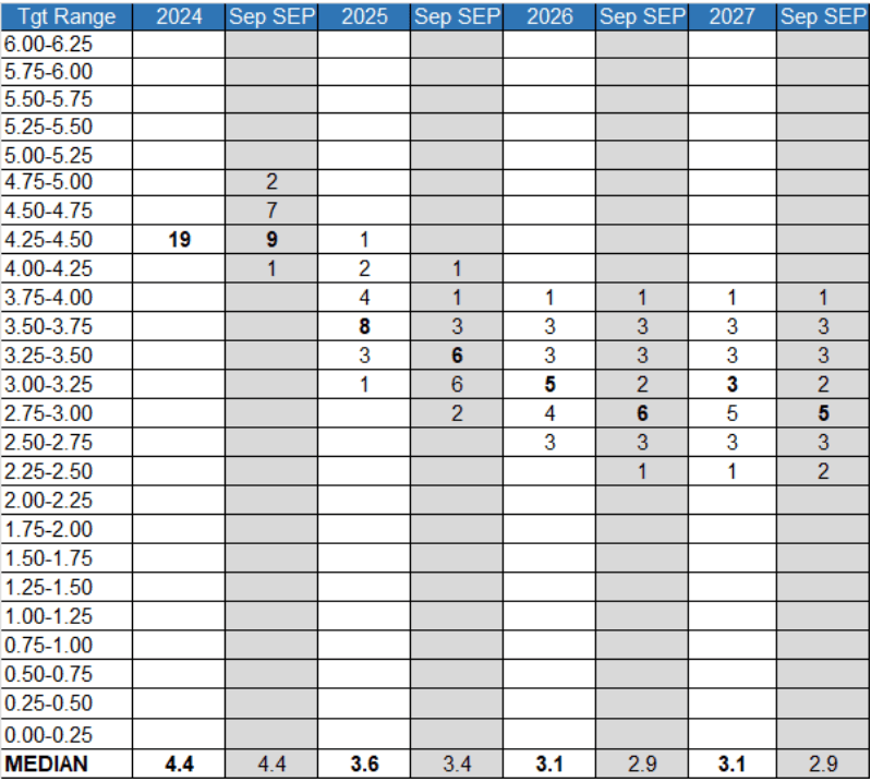 Virtually every member of the Committee, from Chair Powell on down, has implied or outright said that the pace of easing envisaged in September can be dialled back somewhat in light of an apparent diminishing downside risks to employment and unexpectedly stubborn inflation in Sep-Oct. In the last Dot Plot, the 3.4% median was fairly solid, with 6 participants on that figure, and a further 8 below that.