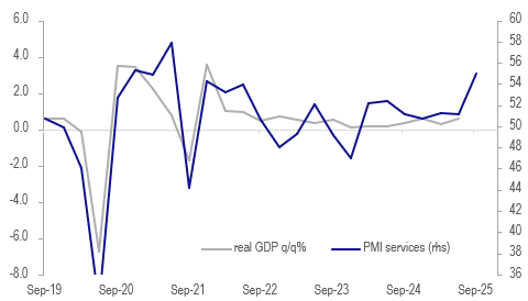 The August JP Morgan global manufacturing PMI printed at 50.9 up from 49.7 signalling growth in activity in the sector again and at its fastest since May 2024. The pickup was driven particularly by higher output but also domestic orders and a return to hiring but confidence remained below average. The PMI, LME metal prices and the Baltic Freight Index (BFI) are all consistent with global IP and trade growth remaining at current rates or possibly improving.