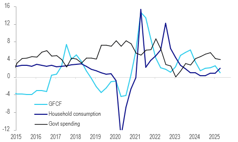 Q2 GDP was stronger than both the RBA and consensus expected as it rebounded from Q1’s weather-impacted soft result and benefited from holidays. It rose 0.6% q/q to be up 1.8% y/y, the strongest since Q3 2023, after 0.3% q/q & 1.4% y/y in Q1. Growth was driven by private and public consumption with net exports adding 0.1pp while both inventories and investment detracted. Given the RBA’S cautious stance towards easing and recent stronger data, a September rate cut looks unlikely and November will depend on new information and the outlook.