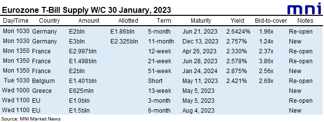 Greece and the EU both look to issue bills today while Germany, France and Belgium have already sold bills this week. We look for issuance of E15.9bln at first round operations, down from E18.9bln last week.