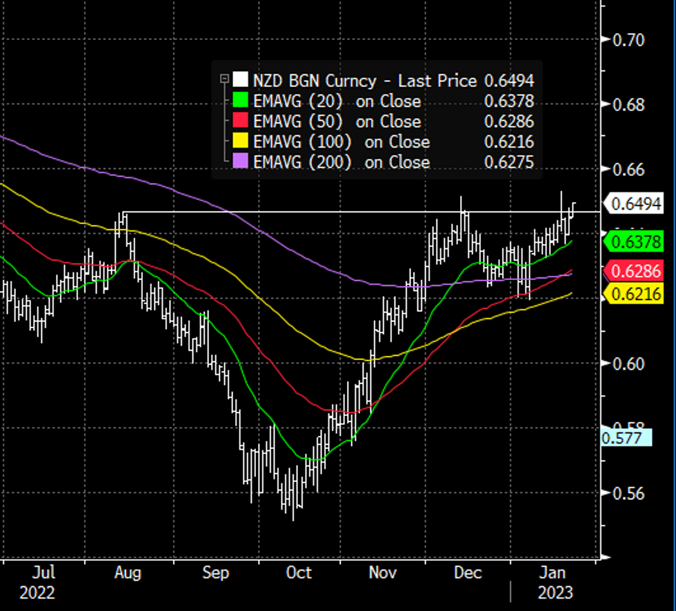 NZD/USD is up ~5% from lows seen in early January. The pair has consolidated gains above $0.64, a level we had previously flagged earlier this month.