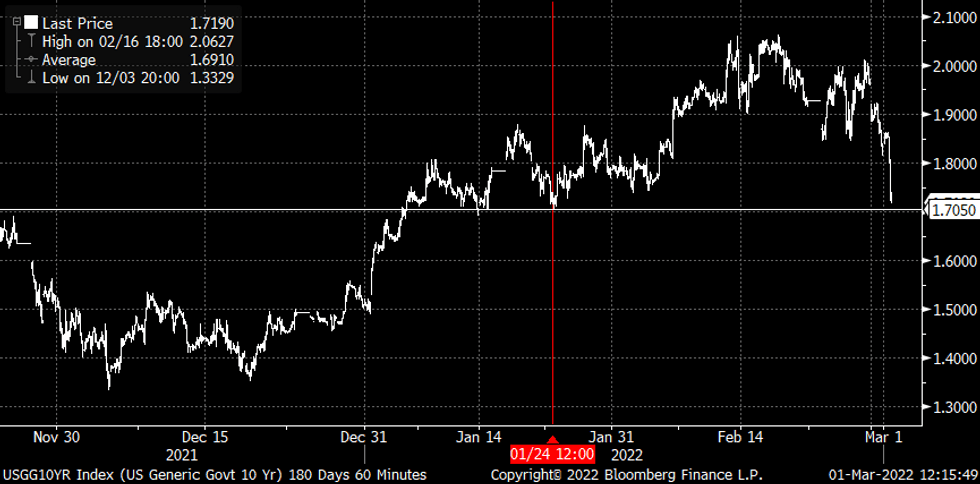 - Russia/Ukraine crisis escalates: risk-off/safe haven buying across FI mkts: 30YY falls to 2.0729% -0.0882 , 10YY 1.7190% -.1060.