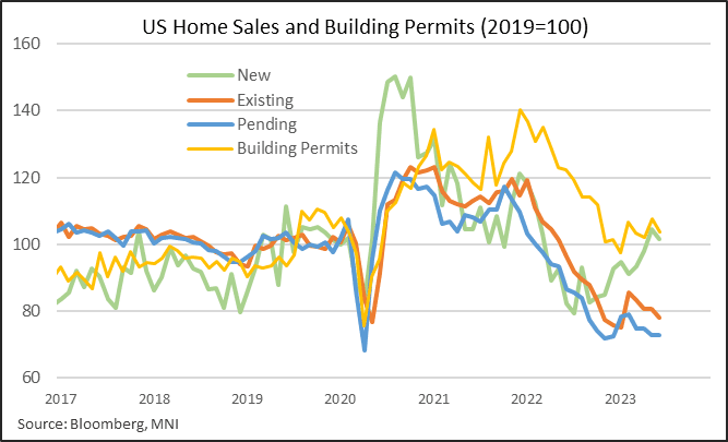 - Today’s pending home sales data were slightly stronger than expected, rising +0.3% M/M in June (cons -0.5%) after -2.5%, but still reinforced the difference in the recoveries seen in new and existing home sales since mortgage rates peaked in late 2022.