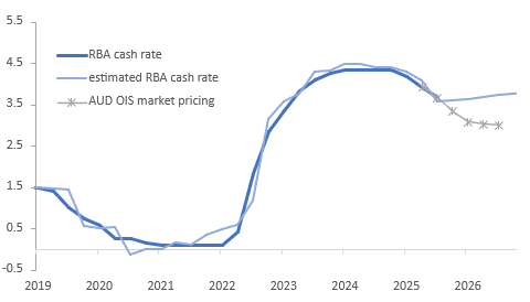 Our simple RBA policy reaction function is showing that based on the growth and inflation outlook rates should stay around 3.6% through H1 2026 with no further easing as underlying inflation remains above the 2.5% mid-point of the target band.