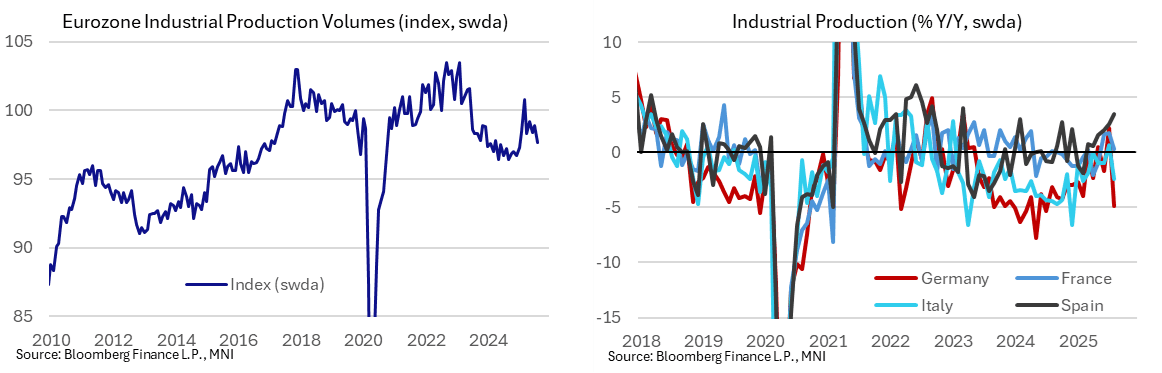 Euro area industrial production fell -1.2% M/M in August, albeit not as weak as the -1.6% expected after all 'big 4' countries contracted. While a July revision (0.5% from 0.3% unrevised) underpins the upward surprise, Ireland had an outsized positive impact this time, at 9.8% M/M. Sequential weakness was broad-based in August with all main categories except non-durable consumer goods down M/M.