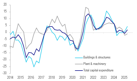 Private sector capex remained soft in Q2 with volumes rising 0.2% q/q, driven by the non-mining sector, after falling 0.2% q/q to be up only 1.7% y/y although this was an improvement from Q1’s -0.6% y/y. There has been talk that investment needs to rise in order to see progress on productivity, which has been weak. Q2 GDP is released September 3 with inventories September 1, and net exports and public demand contributions September 2.