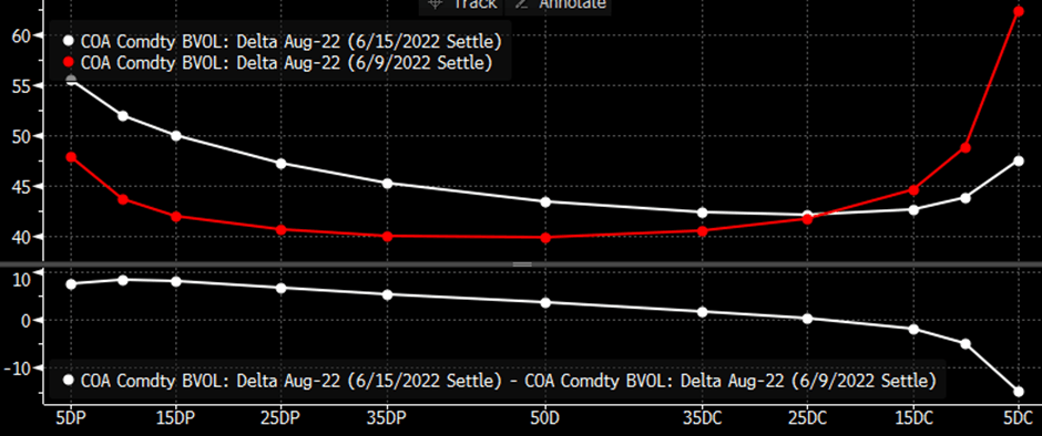 The increased risk of reduced oil demand growth is reflected in the shift in the volatility surface. The implied vol of 25 delta Brent puts for August has increased to 5% above calls with Dec22 puts also now 3% higher.