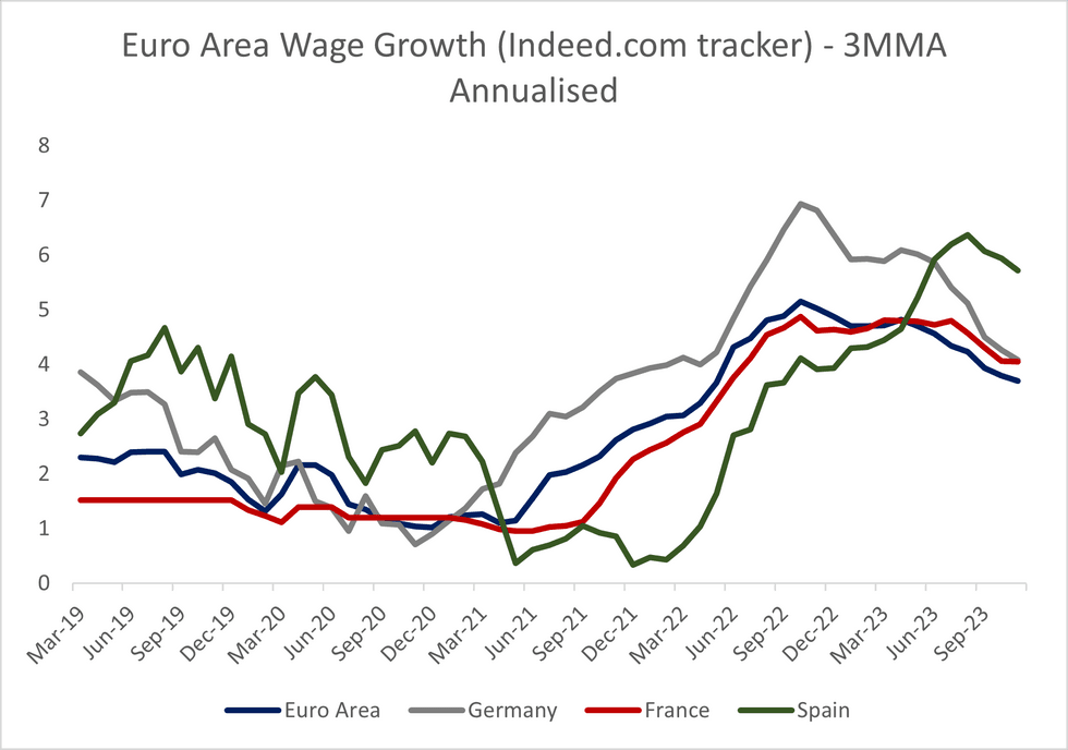 The Eurozone Indeed Wage tracker fell in November to a 3.7% 3MMA annualised rate. This represents the 7th consecutive month that the indicator has softened. The tracker peaked at 5.2% in October 2022.
