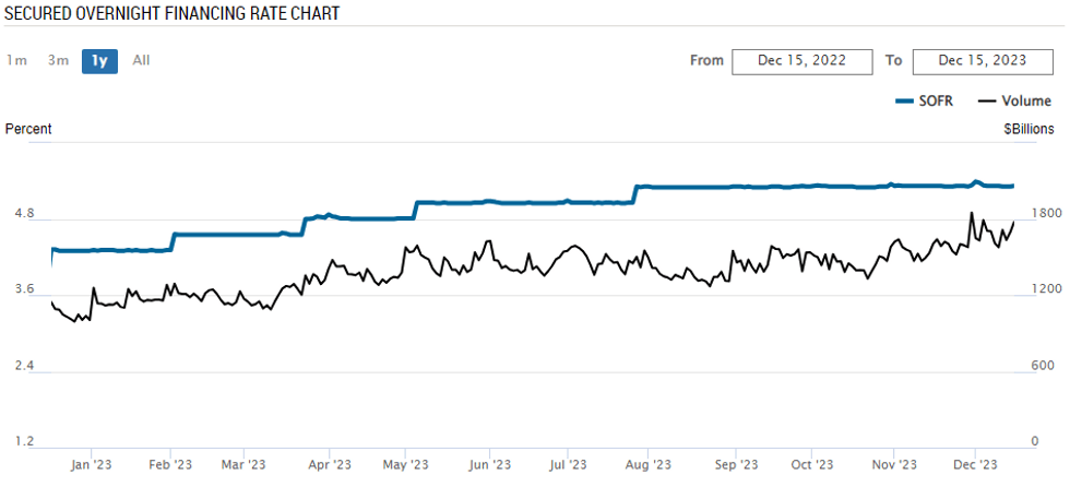 SOFR ticked back up 1bp to 5.32% after three sessions at 5.31%. Highest SOFR volumes since Dec 5, closer to the high of $1850 from Nov 30.