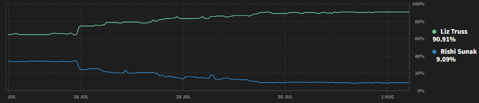 Betting markets continue to show Foreign Secretary Liz Truss as the odds-on favourite to win the Conservative leadership contest and become the next UK PM. Data from Smarkets gives Truss a 90.9% implied probability of winning the contest, with former Chancellor Rishi Sunak sitting on an implied probability of just 9.1%.