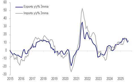 September customs export growth was significantly stronger than Bloomberg consensus expected rising 19.0% y/y after 5.8%, highest since March 2022. While imports were also higher up 17.2% y/y following 15.8%, the pickup in shipments was enough to return the merchandise trade balance to surplus at $1275mn after August’s deficit of $1964mn. The Bank of Thailand expects slower exports in H2 to be a drive of slower GDP growth. The full goods trade data are released Friday.