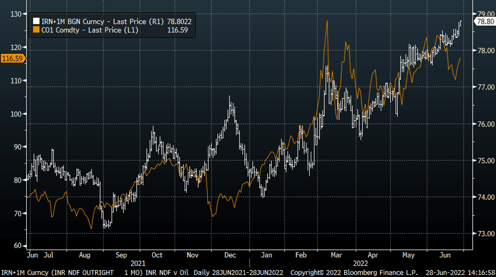 Spot USD/INR is pushing higher, up +0.35% versus yesterday's close. This puts us above 78.60, which is fresh record highs for the pair. The 1-month NDF has also pushed to 78.84, also a fresh high.