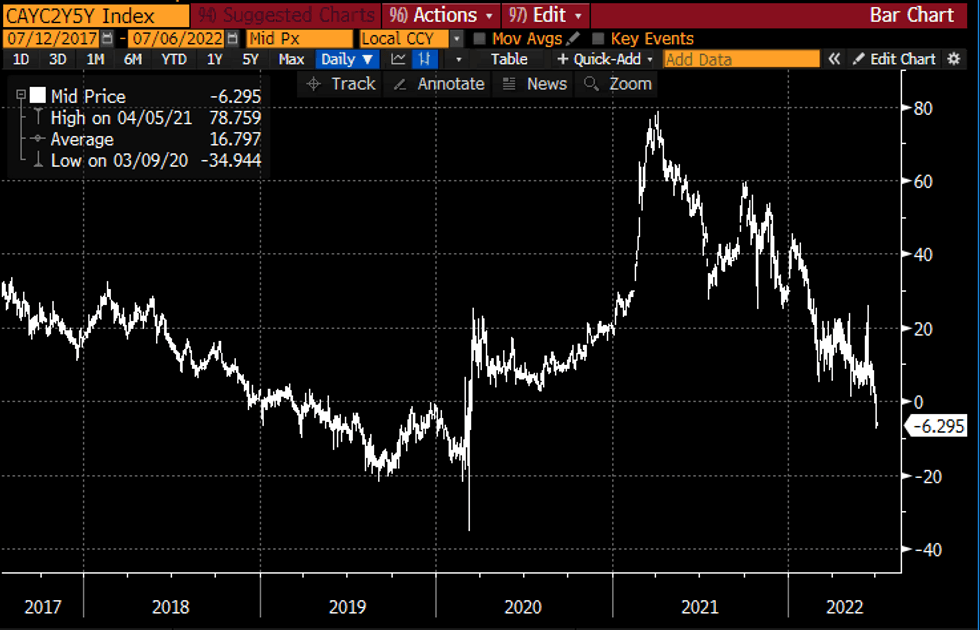 - Recession expectations priced in front end: Dec'22/Mar'23 inverted at -0.125. Most inverted calendar spd: EDH3/EDH4 extends to -0.745.