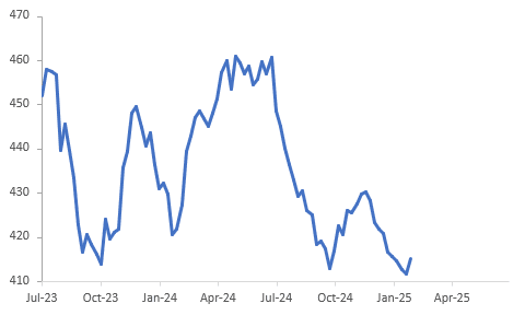 - The EIA reported a crude inventory build of 3.46mn barrels last week, slightly less than Bloomberg consensus. It was the first rise since mid-November as there has been a sharp increase of flows from Canada to beat the February 1 tariffs. Gasoline stocks rose 2.96mn while distillate fell 4.99mn. Refinery utilisation is down 2.4pp to 83.5%, which is usual at this time of year.