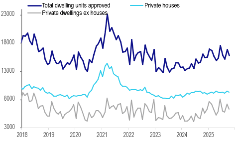 The number of building approvals fell 6.4% m/m in October, weaker than expected, after rising 11.1% m/m to be down 1.8% y/y. Multi-dwelling approvals have been driving the volatility in the headline number but annual growth in both it and private houses is soft and likely to add to already strong house price growth. Approvals have moved sideways this year.