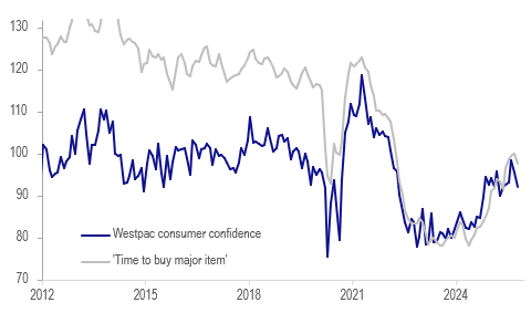 Westpac consumer confidence fell for the second straight month in October as higher inflation prints appear to have weighed on assessments of family finances and the economy. Thus, Q3 CPI on 29 October is likely to be important for households too. The RBA’s decision to leave rates at 3.6% and cautious tone appear to have actually reassured consumers. Sentiment was down 3.5% m/m to 92.1, the lowest in 6 months. Households remain cautious but are prepared to spend at the right price. Q3 expenditure growth improved compared to Q2 with signs of a pickup in discretionary spending.